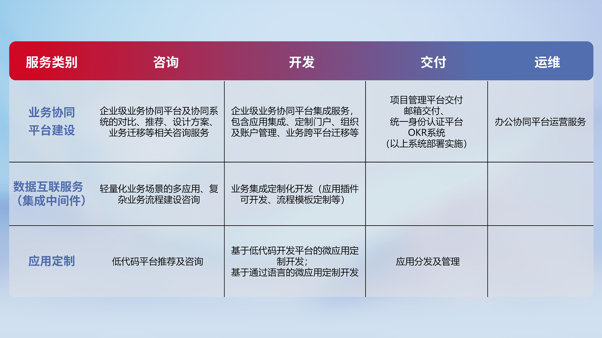 针对钉钉、、、、企微、、IDaas等平台级产品提供产品的规划、、、、方案、、交付、、定制化开发等服务,,,实现如统一协同办公、、、智能客户服务、、、混合会议管理、、智能数据查询、、等业务场景,,,,实现数字化转型。。。